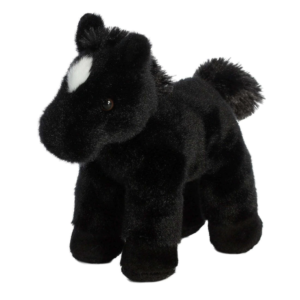 Este caballo es de un negro oscuro intenso en todo el cuerpo con una raya blanca en la frente. Llévate a casa este caballo de peluche negro para una adición fantástica y realista a tu colección.